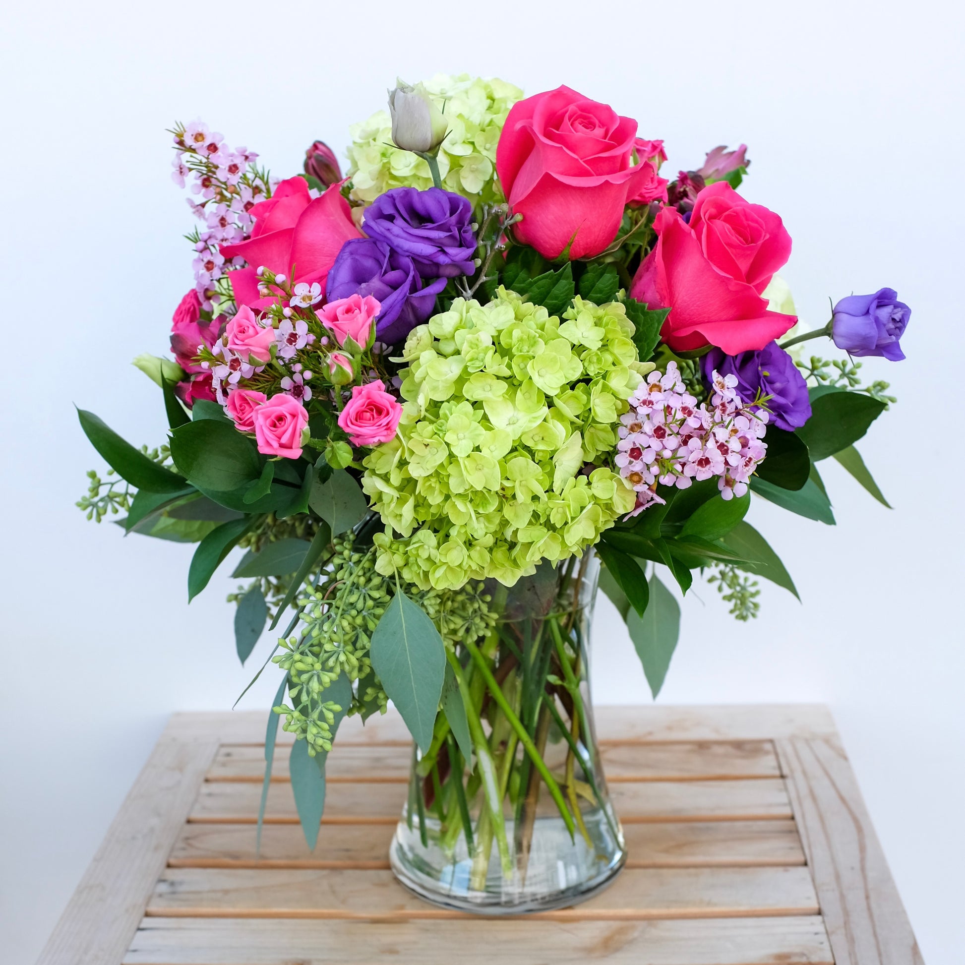A cheerful blend of fuchsia roses and green hydrangea are arranged in a tall vase together with other brightly coloured blooms. The arrangement shown here is a medium size.
