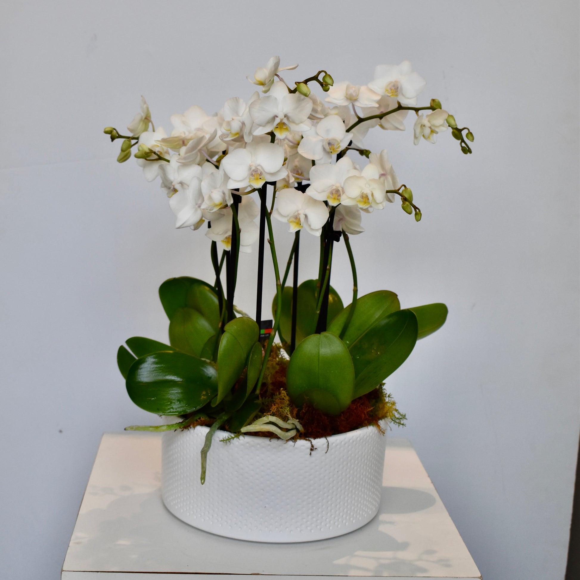 Five mini white double spike phalaenopsis orchids potted in a 8" diameter white ceramic bowl. Overall height is approximately 12"